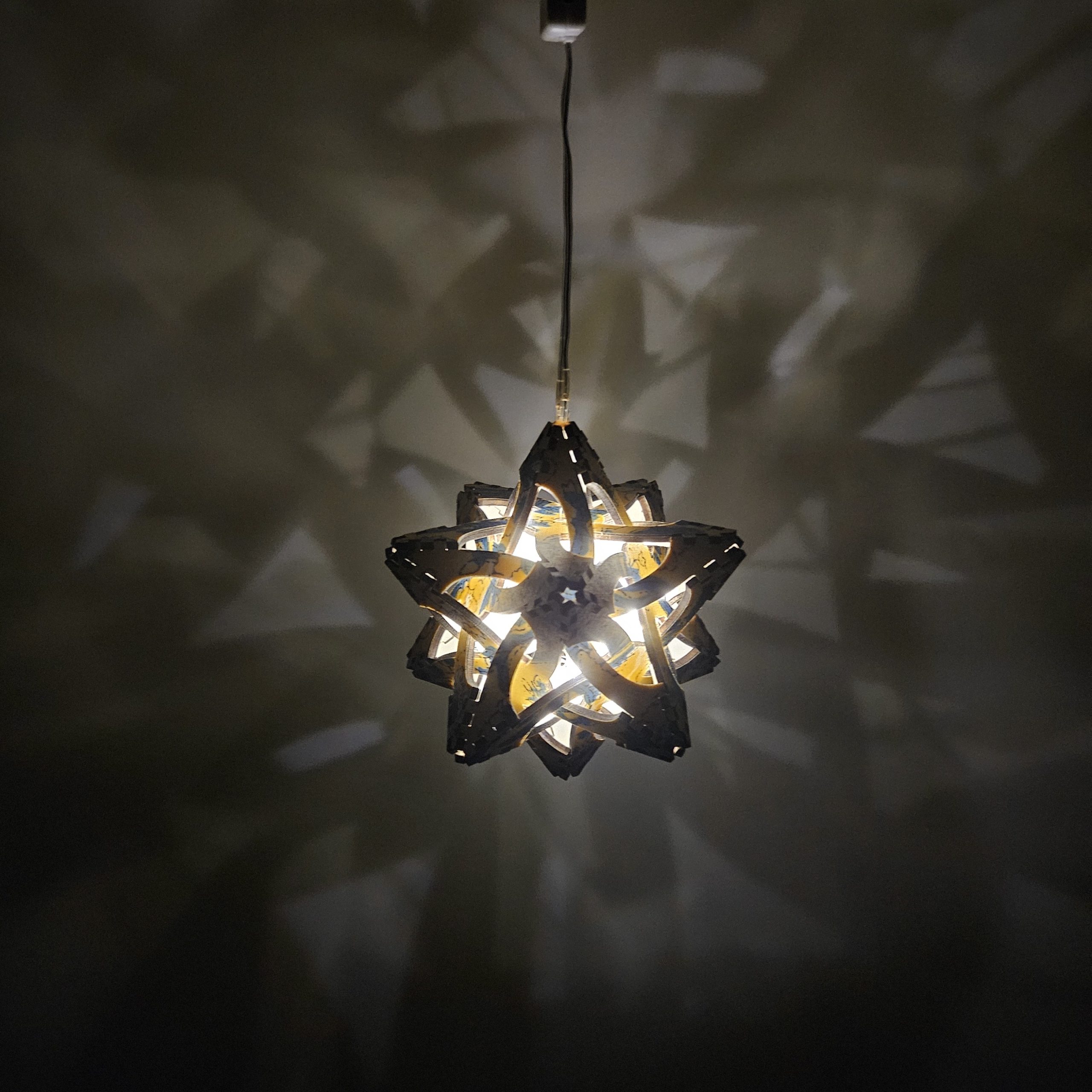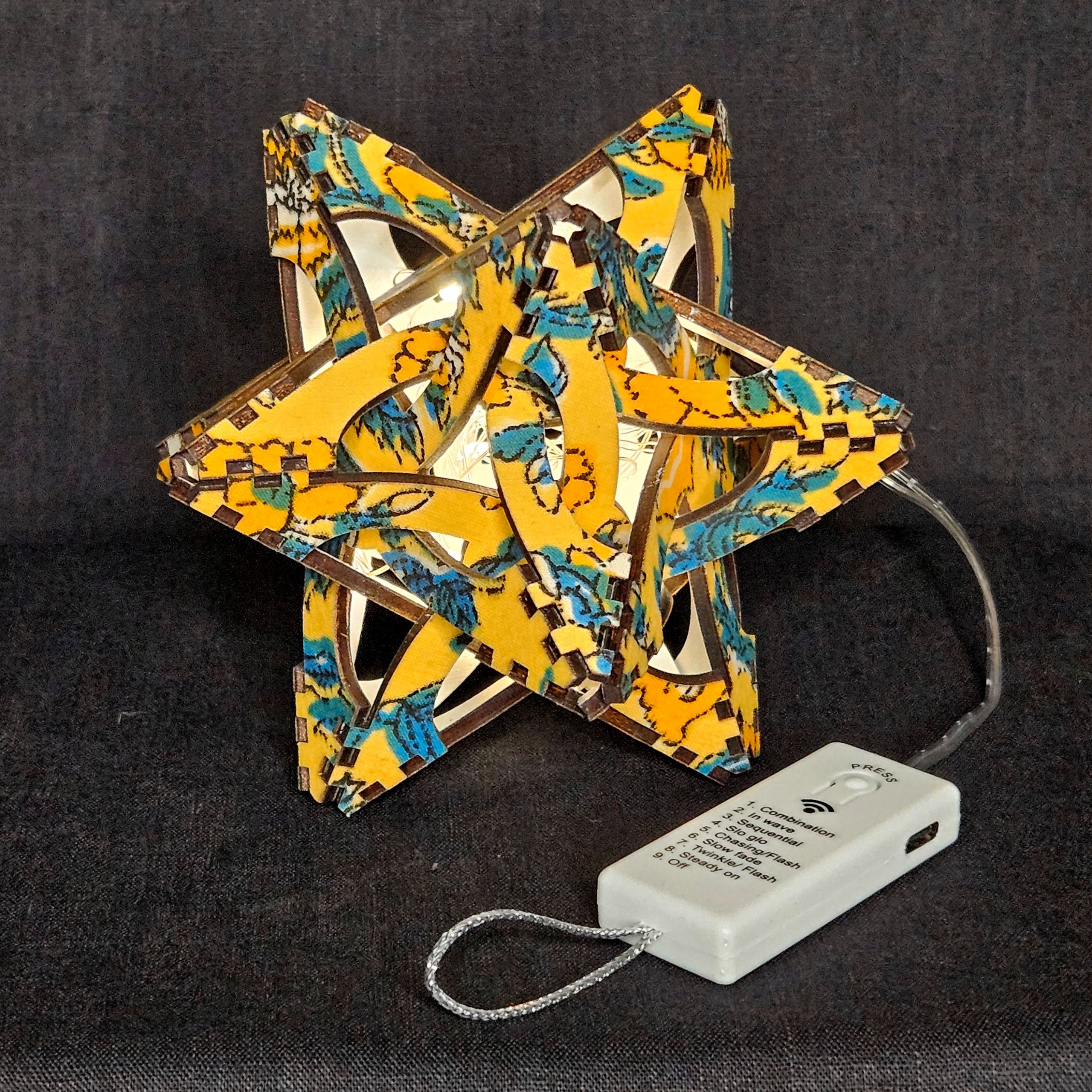 To make these charming stars, I start by bonding fabric to plywood using multiple coats of adhesive and sealer. I paint and seal the reverse side. Then, I cut, clean and assemble the 12 pieces. I insert the LED light strand and secure it with UV resin. Finally, I attach a rechargeable battery pack to which I have added a loop and a holographic sticker. I hope you enjoy these beautiful stars! Check out the build time-lapse on their gallery page.